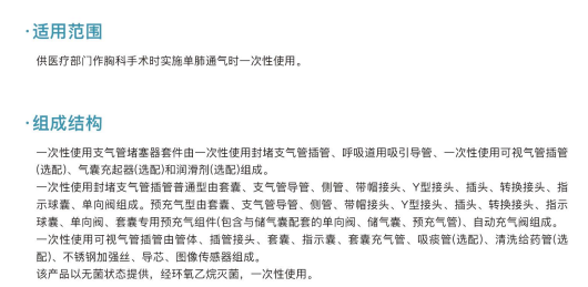 一次性使用支氣管堵塞器套件由一次性使用封堵支氣管插管、呼吸道用吸引導(dǎo)管、一次性使用可視氣管插管(選配)、氣囊充起器(選配)和潤(rùn)滑劑(選配)組成。產(chǎn)品供醫(yī)療部門(mén)作胸科手術(shù)時(shí)實(shí)施單肺通氣時(shí)一次性使用。