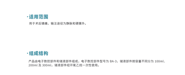 產(chǎn)品由電子數(shù)控部件和儲液部件組成,電子數(shù)控部件型號為 BA-3,儲液部件按容量不同分為 100ml、200ml 和 300ml,儲液部件經(jīng)環(huán)氧乙烷滅菌一次性使用。