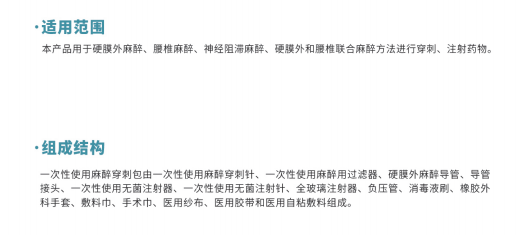 一次性使用麻醉穿刺包由一次性使用麻醉穿刺針、一次性使用麻醉用過(guò)濾器、硬膜外麻醉導(dǎo)管、導(dǎo)管接頭、一次性使用無(wú)菌注射器、一次性使用無(wú)菌注射針、全玻璃注射器、負(fù)壓管、消毒液刷、橡膠外科手套、敷料巾、手術(shù)巾、醫(yī)用紗布、醫(yī)用膠帶和醫(yī)用自粘敷料組成。