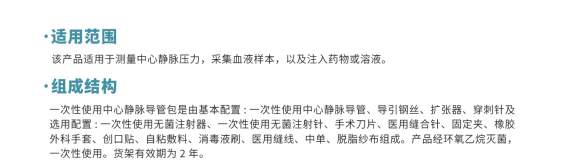 一次性使用中心靜脈導(dǎo)管包是由基本配置:一次性使用中心靜脈導(dǎo)管、導(dǎo)引鋼絲、擴(kuò)張器、穿刺針及選用配置:一次性使用無(wú)菌注射器、一次性使用無(wú)菌注射針、手術(shù)刀片、醫(yī)用縫合針、固定夾、橡膠外科手套、創(chuàng)口貼、自粘敷料、消毒液刷、醫(yī)用縫線、中單、脫脂紗布組成。產(chǎn)品經(jīng)環(huán)氧乙烷滅菌,一次性使用。