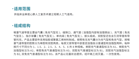 喉罩氣道導(dǎo)管主要由氣囊(免充氣型無)、縫隙口、通氣管(加強(qiáng)型內(nèi)部有加強(qiáng)鋼絲)、充氣管(免充氣型無)、指示球囊(免充氣型無)、單向閥(免充氣型無)、接頭等組成,雙腔型還包含引流導(dǎo)管和導(dǎo)管托坯。